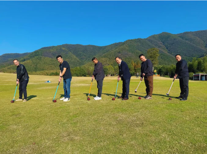 在专业教练指导下,组员们手握球杆、瞄准目标,在草坪上体验击球、推进、过门的趣味流程,分组竞赛的互动中,欢声笑语与团队协作的默契交织。这场“大众高尔夫”不仅让大家释放了工作压力,更让组员们直观感受到广德以赛事为媒、推动“体育+文旅+康养”融合的发展思路——正如木球滚动的轨迹,串联起城市的生态优势与产业活力。
