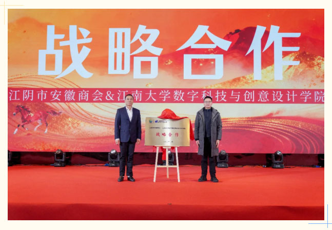 随后,江南大学数字科技与创意设计学院VCR的播放,为现场带来了跨界合作的喜讯——江阴市安徽商会与江南大学数字科技与创意设计学院正式举行授牌仪式,标志着双方将在人才培养、科技创新等领域展开深度合作,为商会企业高质量发展注入新动能。