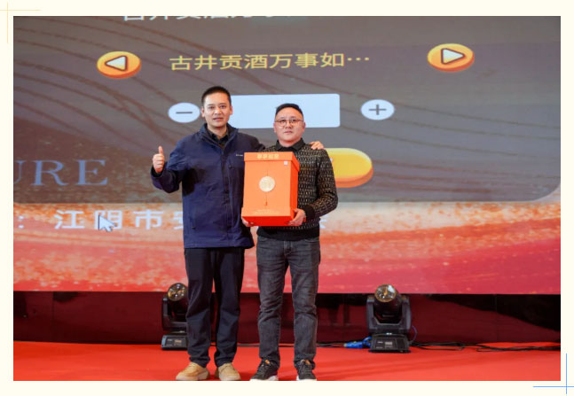 第三轮抽奖中,庞辉副会长、江阴晨瑞橡塑有限公司总经理刘治峰分别抽取4名嘉宾,送出古井贡酒小酒礼盒,酒香四溢间传递着新春的美好祝愿。