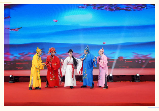 由李海涛、苑青、周华伏、杨义杰、蒋博文带来的小品《争花夺艳》,以幽默诙谐的表演风格,展现了徽商积极向上的精神风貌,引得现场笑声不断。